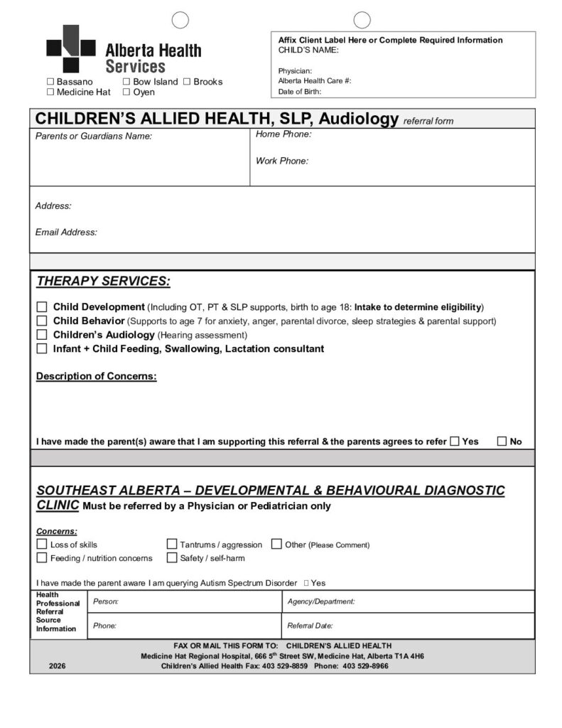 Families may self-refer. For third-party referrals, parent/legal guardian must be aware of and give permission for referral. All referrals are made through the Medicine Hat location